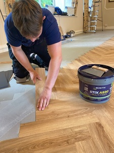 Following the moisture barrier, a final application of SL C955 ADVANCED smoothing compound created a perfectly smooth surface ready for adhesive application. The contractor chose STIX A930 MULTI FASER, a fibre-reinforced, high-temperature adhesive for bonding the Tarkett Inspiration Classic LVT. This particular adhesive choice was especially appropriate given the room's large windows and potential exposure to solar gain - conditions where standard adhesives might fail.