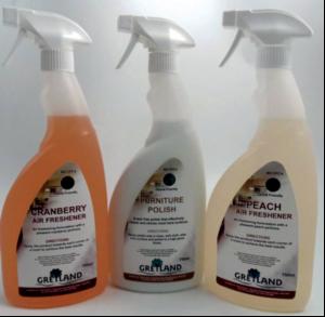 Spice, cranberry, or peach - these are the subtle fragrances available in some of the wellknown Greyland range of readyto- use trigger spray housekeeping products.